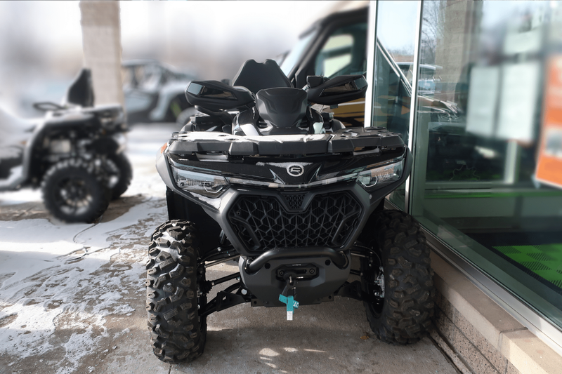 • ADDITIONAL FEATURES: Passenger seat, brushless electronic power steering, Bosch® EFI with work/normal/sport modes, 3500 lb. winch with synthetic rope, CFMOTO LED™ headlights & taillights with daytime running lights, steel racks with composite cover, 7" TFT display, Bluetooth call indicator, 2” receiver, hand guards, heavy-duty steel bumpers, fender flares, 12V outlet, USB port, Downhill Assist Control