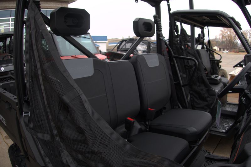 • ADDITIONAL FEATURES: Electronic power steering, Bosch® electronic throttle with work/normal modes, 3500 lb. winch, 2-person bench seat, LCD display, CFMOTO RideSync app compatible (T-Box), 12V outlet, USB port, side mirrors, side nets, Ridevision™ LED headlights/taillights with backup lights, tilt steering, roof, skid plate, rear sway bar, locking rear differential, large 9.25 gal. fuel tank, 2” receiver, adjustable driver’s seat, under-seat storage area, front bumper