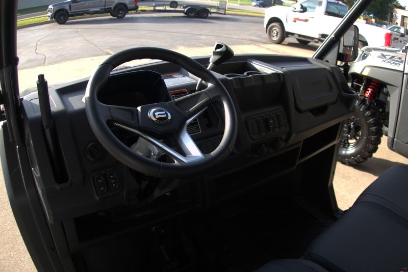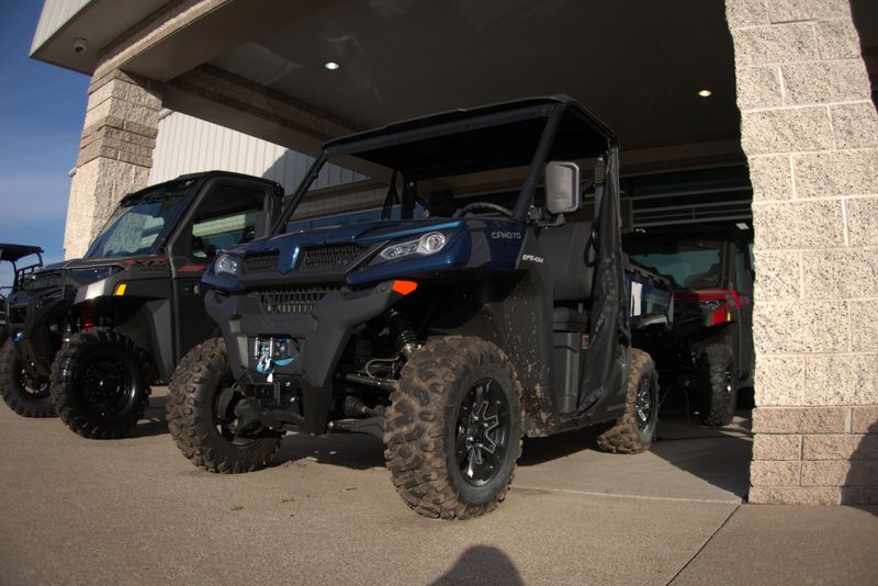 • ADDITIONAL FEATURES: Electronic power steering, Bosch® electronic throttle with work/normal modes, 3500 lb. winch with synthetic rope, 3-person bench seat, dual drive modes, 5” TFT display, CFMOTO RideSync app compatible (T-Box), 12V outlet, USB port, side mirrors, side nets, LED headlights/taillights with back up lights, tilt steering, roof, skid plate, rear sway bar, locking rear differential, large 10.6 gal. fuel tank, 2” receiver, adjustable driver’s seat, under-seat storage area, removable storage box, front bumper