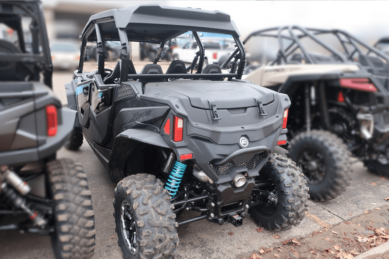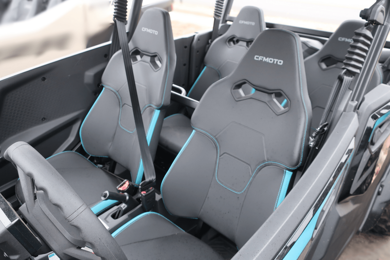 • ADDITIONAL FEATURES: Electronic power steering, 4500 lb. winch with synthetic rope, electronic throttle with normal/sport modes, LCD display, CFMOTO RideSync app compatible (T-Box), 12V outlet, USB port, LED headlights/ taillights with backup lights, roof, fender flares, tilt steering, adjustable driver's seat, half doors, rear cargo box cover, 2” receiver, HDPE skid plate, front bumper, bus bar, front & rear swaybars