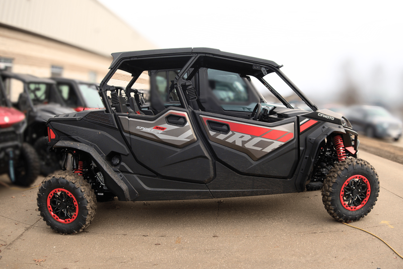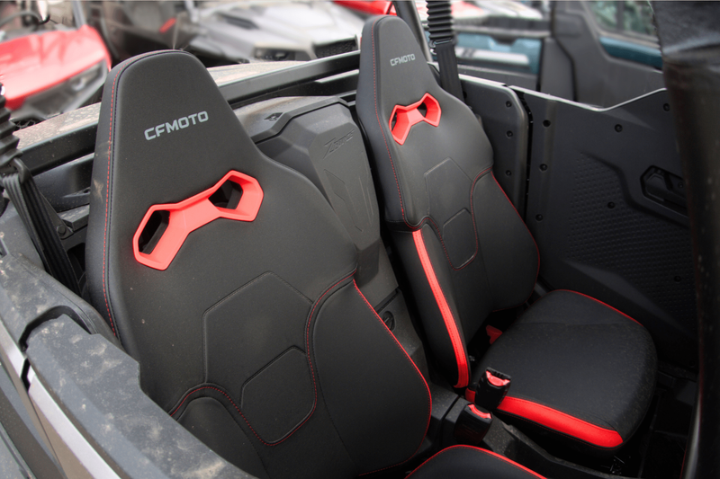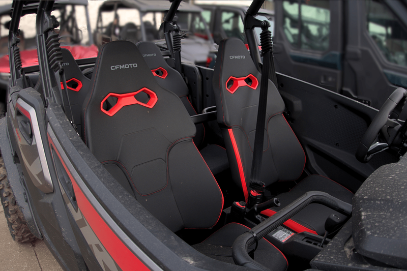 • ADDITIONAL FEATURES: Electronic power steering, 4500 lb. winch with synthetic rope, electronic throttle with normal/sport modes, LCD display, CFMOTO RideSync app compatible (T-Box), 12V outlet, USB port, LED headlights/ taillights with backup lights, roof, fender flares, tilt steering, adjustable driver's seat, half doors, rear cargo box cover, 2” receiver, HDPE skid plate, front bumper, bus bar, front & rear swaybars